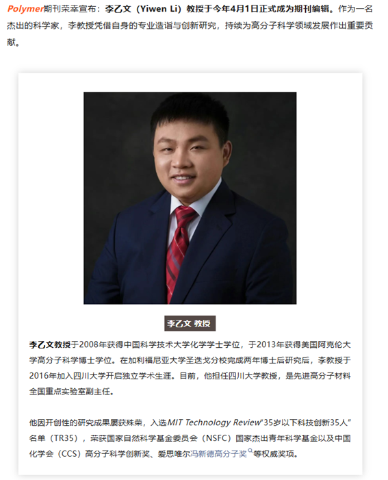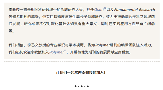 近日Elsevier出版社宣布课题组组长李乙文老师加入了Polymer期刊编辑团队!Polymer是由Elsevier出版的高分子科学领域国际学术期刊,创刊于1960年,致力于发表聚合物物理、化学及技术领域的原创研究与重大进展,涵盖聚合物材料、纳米复合材料、聚合物工程、合成与自组装及其在能源、光电子等方向的技术应用,是高分子领域最知名的期刊之一。